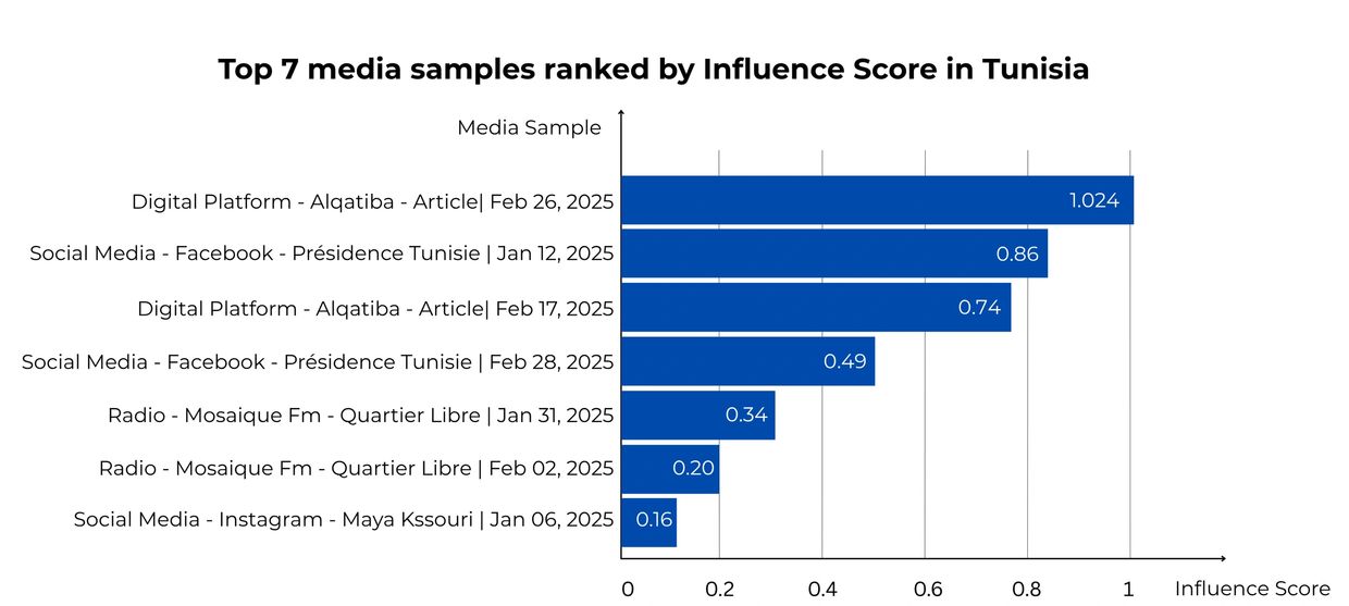 Our study shows that Tunisian media - especially TV and radio - has limited influence. Even the most impactful samples scored only around 1.0 on our Influence Scale. By comparison, top Lebanese samples ranged from 1.4 to over 4.0. This means that while Tunisian media exists in volume, its ability to shape public opinion is relatively weak.